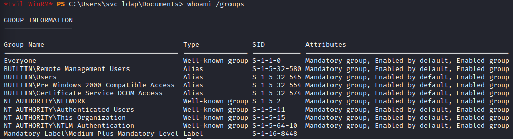 These credentials can be used with the open-source tool EvilWinRM, which takes advantage of Windows Remote Management (WinRM) [TCP: 5985], to gain a remote PowerShell terminal session as the svc_ldap user.
