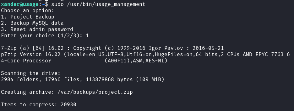 Use the following steps in order exploit the 7z command being ran through the usage_management binary: